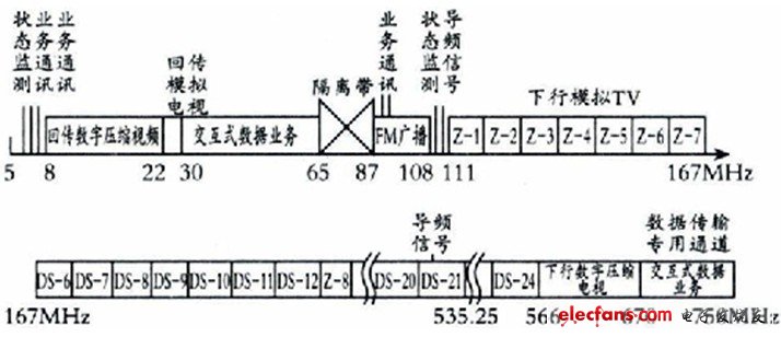 此频率分割配置适合大型综合业务网,上行通路较5-30MHz扩展35 MHz,为开展交互业务提供可能;下行能路有58个模拟电视频道可供使用,同时提供了104MHz的下行数字压缩电视的频率空间,约可传送120套的数字压缩电视节目,为提供NVOD服务创造了条件;在最高端有80MHz的带宽,可开展交互式数据业务。