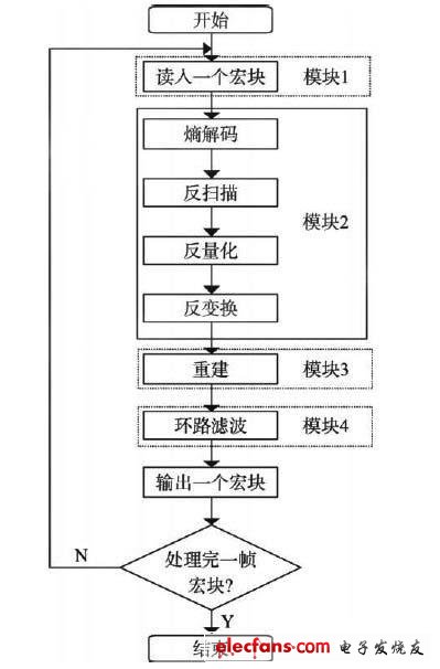 一个视频宏块只有遍历这四个模块之后才算最终完成解码,各个模块之间传递的中间数据如果放置在片外SDRAM中,势必影响下一个模块获取数据的速度,如果数据放置在片内SRAM中,由于片内RAM空间有限不能存储整帧数据。所以权衡考虑,每个模块完成一个宏块行(假设一幅图像包含有M个宏块行,每行有N个宏块)的解码后再交给下一个模块处理,这样既可以将中间数据放置在片内又可以充分利用L1P,减少各个模块之间的代码冲刷,直到M 个宏块行全部处理完毕,这样就得到一帧数据的解码图像。