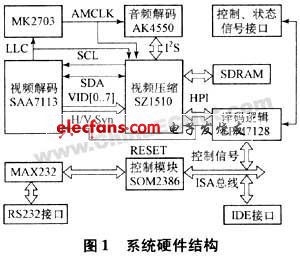 系统上电后,som2386初始化音视频编码模块,系统正常启动后,saa7113对输入的复合视频信号进行解码,生成ccir-601数字视频流,ak4550采集输入的模拟音频信号,生成pcm数字音频流,分别送入压缩编码芯片sz1510,压缩成mpeg-1系统流后,在som2386控制下以文件形式存储到电子硬盘。