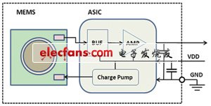 麦克风结构:ECM模拟麦克风通常是由振膜,背极板,结型场效应管(JFET)和屏蔽外壳组成。振膜是涂有金属的薄膜。背极板由驻极体材料做成,经过高压极化以后带有电荷,两者形成平板电容。当声音引起振膜振动,使两者距离产生变化,从而引起电压的变化,完成声电转换。利用结型场效应管用来阻抗变换和放大信号,有些高灵敏度麦克风采用运放来提高麦克风灵敏度(见图1a)。ECM数字麦克风通常是由振膜,背极板,数字麦克风芯片和屏蔽外壳组成,数字麦克风芯片主要由缓冲级,放大级,低通滤波器,抗模数转换组成。缓冲级完成阻抗变换,放大级放大信号,低通滤波滤除高频信号,防止模数转换时产生混叠,模数转换将放大的模拟信号转换成脉冲密度调制(PDM)信号,通常采用过采样的1位Δ-Σ模数转换(见图1b)。MEMS模拟麦克风主要由MEMS传感器,充电泵,缓冲放大器,屏蔽外壳组成。参照图1c, MEMS传感器由半导体工艺制成的振膜,背极板和支架构成,通过充电泵给背极板加上适当的极化偏压。缓冲放大器完成阻抗变换,放大信号。MEMS数字麦克风主要由MEMS传感器,充电泵,数字麦克风芯片和屏蔽外壳组成,参照图1d。为了提高麦克风抗干扰能力,麦克风内部电源和地之间都增加了小的滤波电容,通常是10pF和33pF并联。
