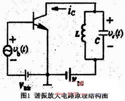 谐振电路原理图中的LC并联谐振回路用电阻Rc代替,就是典型的共发射极电路。它的电压放大倍数是Au=βRc/rbe(这里是其绝对值,没有考虑相位问题)。由于Rc对所有的频率分量都呈现出相同的阻值(阻抗),故这个电路没有频率选择作用(即在很宽的频率范围内,其放大倍数是一样的)。若Rc用LC并联谐振回路代替,由于谐振阻抗的频率特性,使得在谐振频率点及左右极小的频率范围内呈现出很高的阻抗,使电路的电压放大倍数很高,而离开谐振点的其他频率范围都呈现出极低的阻抗(理想状态下可以看做为零),使电压放大倍数接近于零,于是这个放大器就有了对某一频率有选择性的放大特性,称为谐振放大器。
