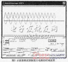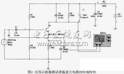 在小信号谐振放大中,电路的输入信号中除了所需要的信号外还有不需要的信号,它们的频谱往往不同,所以用选频的方法,选取需要的频率分量,抑制不需要的频率分量。另外,其中有用信号的幅度往往也很小,处理这种信号必须具有选频和放大双重功能。小信号谐振放大器电路中晶体管集电极负载是LC并联谐振电路,其阻抗是随频率而变化的,回路谐振频率f0上的阻抗为纯电阻并且是最大的,因此谐振放大器在负载回路的谐振频率上具有最大的电压放大增益,稍离开此谐振中心频率,电压增益就会迅速减小。在分析中采用仿真软件来测试谐振放大电路的时域的输入输出波形。分析测试电路如图2所示。