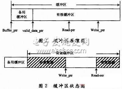 零拷贝缓冲区原理图如图1所示,Read-ptr:视频解码指针,指向待解码的数据;Write_ptr:接收数据指针,指向网络数据的存放地址;valid_data_ptr:有效缓冲区首地址,网络数据存放的首地址。备用缓冲区不存放从网络接收的视频流,当如图2所示,有效数据分为2块时,并且解码数据分别存在于缓冲区中的2个部分,则传递给解码器Read-ptr并不能满足要求,因此需要使用到备用缓冲区,具体策略是将Read-ptr后的数据拷贝到Buffer_ptr里,使得解码数据变成一块连续缓冲区。由于在视频监视系统中,一帧数据的数据量比接收缓冲区小得多,因此发生这种拷贝的几率很少,而且每次拷贝的数据量也很少,能大大优化系统性能,提高监视终端解码、显示的效率。