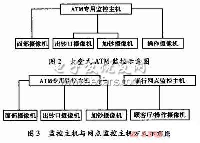 这种方式用于大堂式的ATM机型的监控,由于该类ATM机受所安装位置的限制,往往将硬盘录像机小型化后与ATM同时安装在灯箱体内的一个设备箱内,由于所有设备线路的布设基本是在ATM机及其附属设备内部,因其安装灵活度大,可以较好地满足不仅大堂式ATM的安装,也适用于穿墙式ATM机器的安装,如图2所示。大堂式ATM还有采用专用监控主机与网点监控主机各付其责的监控方式,如图3所示。