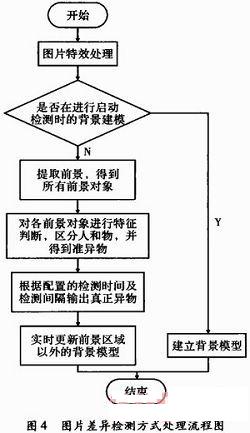 首先进行背景建模、前景提取。利用数学统计模型,把众多图片的统计信息保存到模型中,再用当前图片和该模型比较,提取出可能存在异物的地方。该方法的背景可以达到几个小时甚至一天的图片的统计值,增强了检测功能对各种环境的适应性,大大降低了误报,也降低了光线的影响,同时在在背景建模、前景提取方法的基础上又加入一些物体特征判断,可降低误报,提高检测的准确率,检测流程如图4所示。