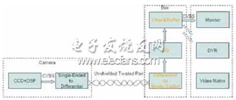 在摄像机端,一般采用无源变压器将单端CVBS视频信号转换成差分视频信号;双绞线传输设备完成差分信号至单端信号的转换以及视频信号的放大、滤波、驱动;信号输出可接至监视器、DVR设备或视频矩阵设备。双绞线一般是5类双绞线,如网线。