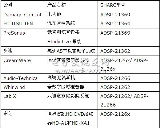 关注专业音频产品的工程师可能会注意到一个现象:浮点DSP代表产品SHARC处理器受到越来越多工程师和企业的青睐,仅在2008年到2009年一年多的时间内就有若干业界知名企业在他们的音频产品中选用SHARC处理器——PreSonus 公司的StudioLive数字音频混合器和多通道录音系统、Damage Control公司的电吉他、FUJITSU TEN公司的汽车音响系统……这样的应用案例近年来迅速增多,表1列出了几个SHARC处理器的典型应用案例。