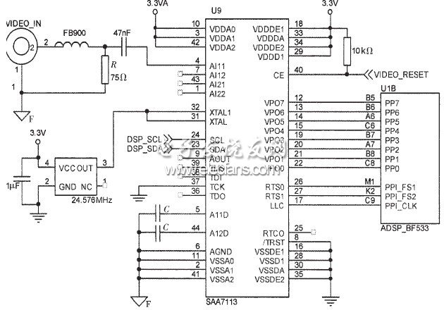 图2为H.264编码系统的视频输入模块。7113芯片从视频端子读入摄像头输出的模拟信号,通过并口将数字信号输出给Blackfin533。Blackfin533通过I2C总线对7113进行配置,使其输出YUV模式、ITU656模式及增强ITU656模式等。