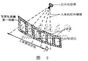 红外传感器的光学系统可以将来自多个方向的红外辐射能量经反射或特殊的透镜透射后全都集中在红外传器上。这样,红外探测器就可以探测到某一个立体防范空间内辐射的变化。当防范区域内没有移动的人体等目标时,由于所有的背景物体在室温下红外辐射的能量比较小,而且基本上是稳定的,所以不能触发摄像头,即摄像头不工作。当有人体在探测区域内走动时,就会造成红外热辐射能量的变化。红外传感器将接收到的活动人体与背景物体之间的红外热辐射能量的变化转换为相应的电信号,经适当的处理后,送至摄像头,进而拍摄图像。采用菲涅耳透镜组探测移动人体如图2所示。
