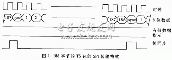 并行传输系统SPI包括一位时钟信号、8位数据信号、一位帧同步信号PSYNC和一位数据有效信号DVALID。帧同步信号对应TS包的同步字节047H,DVALID信号用来区分TS包的长度为188个字节或204个字节。当TS包长为188字节时,DVALID信号一直为高,同时所有信号都与时钟信号保持同步。SPI数据格式如图所示。