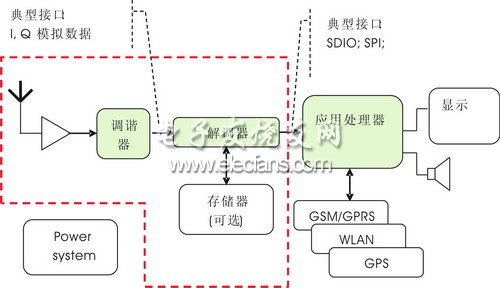 从应用模式来看,移动数字电视终端可以分为3类:笔记本上的应用,重点是DVB-T;手机上的应用,重点是DVB-H、T-DMB;专用设备(如PMP)的应用,重点也是DVB-H、T-DMB。通常来说,移动数字电视终端包含了4个关键部件,天线、调谐器(Tuner)、解调器(De-modulator)和应用处理器。图1 显示了一个典型的移动电视终端的架构。