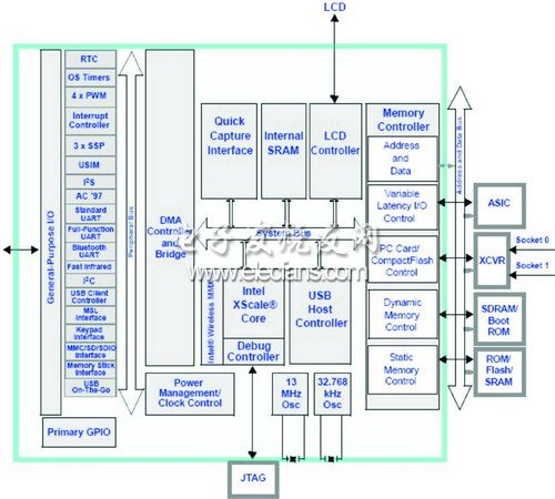 PXA270处理器是一款集成的片上微处理器,广泛的应用于高性能、低功耗、便携、手持设备中。由于采用了on-the-fly电压调整技术,频率调整技术以及成熟的电源管理技术,使得英特尔XScale芯片能够提供业界领先的高性能低功耗(MIPs/mW)性能。PXA27X处理器采用ARM架构,V5TE指令系统,遵从ARM编程模式,同时,PXA27X处理器还为诸如音频和视频处理提供无线MMX集成指令集,从而在一定功耗范围内,大大提高了产品的性能。