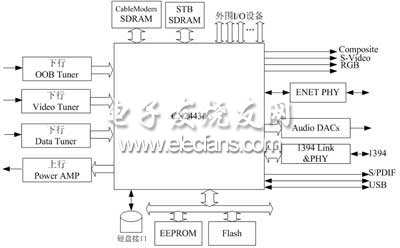 选择芯片时除了要满足基本的接收数字电视功能,还要能够使用户通过有线电视网络实现Internet的高速接入,即要具备STB和Cable Modem两种基本的应用模块。根据这一需求,本设计选择了CONEXANT(科胜讯)公司的交互数字电视机顶盒单芯片CX24430为核心来设计整个系统。