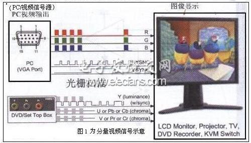 众所周知,视频传输技术中很关注的是视频信号的清晰与真实, 从图1为常见的分量视频信号示意中看出。能否做刭这一点离不开视频信号滤波器、驱动器、和多路开关及电缆传等器件有多种输入/输出的耦合和钳位组合方式,包括了输入交流或直流耦合、输出交流或直流耦合以及各种输入钳位的组合等,这些均是视频传输技术中的连接芯片与技术,应该说是视频格式,为此将对此技术特征作讨论与介绍。