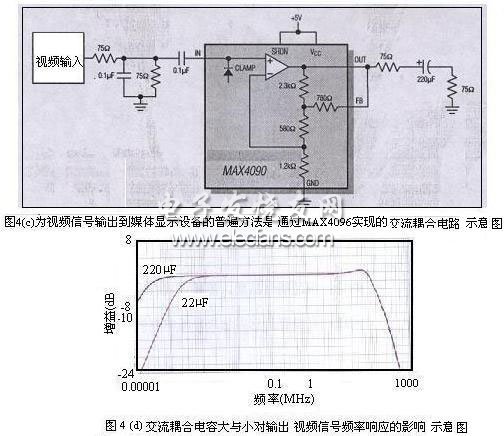 既然交流耦合存在缺点,为什么还一直在使用呢?原因有二。.其一、就是为了起到保护作用,集成电路还没有广泛使用前所采用的一种简单的NPN射极跟随器驱动视频输出电路。万一输出连接器短路至地或电源电压,电容器可防止NPN晶体管损坏。而当前的集成视频放大器具有坚固的短路保护电路,因此发生短路时也不会损坏。其二、从技术特征出发,将视频信号输出到媒体显示设备的最普遍方法是交流耦合(如图4(c)所示), 这使得接收电路可以在自己的输入端建立共模电平,该电平独立于输入视频信号的直流电平。一个75Ω的串联电阻应该尽可能近地放在靠近输出端的位置,这有助于隔离从输出端产生的下行寄生干扰,并提供最佳的信号条件,图4(c)中MAX4090为滤波驱动器。