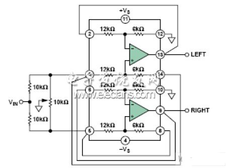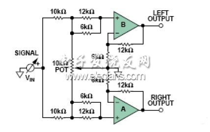 本电路中,信号通过10 kΩ串联电阻在两个放大器之间分配。两个同相输入端之间插入一个游标接地的电位计。电位计和10 kΩ电阻的组合构成一个轻负载,很容易被大多数信号源驱动。放大器的增益配置为3。当电位计游标位于任一端时,一个输入端接地,因此不会有信号传送至对应的输出端。另一输入端的电压为VIN/2,因此其输出为1.5 × VIN。当游标位于中间位置时,两个放大器的输入均为VIN/3,因而各放大器的输出为VIN。这样,通过移动游标(以机械方式或电子方式),一个通道上的信号电平从0连续变化到1.5 × VIN,另一个通道上的信号电平则从1.5 × VIN连续变化到0。对听者而言,声源似乎是在声级之间从一个声道移动到另一个声道。因此,声像或声音的视在源可以位于左右扬声器之间的任意位置。