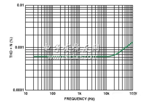 图2显示整个音频范围内的总谐波失真及噪声。误差随频率提高而变大,但20 kHz时总误差仍然小于0.0007%。图3给出了该IC的连接图。