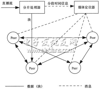 图1是基于P2P的时移电视系统架构,由图1可见,系统包括一个分片处理器、一个媒体定位器以及若干对等节点(Peer)。分片处理器对输入的直播流进行分块和分段处理,形成媒体分块和分段。一个媒体分段包括固定数量顺序编号的媒体分块,段的起始和结束由块头中标志位标识。媒体分段是系统定位和存储媒体的基本单位,媒体分块是系统传输媒体的基本单位。对等节点可从多个其他节点取得分块数据进行解码和播放。为了叙述方便,把播放点附近不断滚动的若干媒体分块定义为一个逻辑上的特殊分段——直播分段。