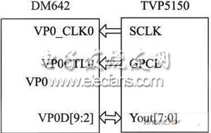 视频信号的采集如图2 所示, SCLK 为时钟,GPCL为使能信号, Yout为8位BT. 656信号。系统中将DM642的VP0配置为VP0A + McASP模式, 其中VP0A 配置为8位BT. 656视频输入, 用来接一路视频输入。TVP5150PBS是一款高性能的视频编码器, 它将视频信号模拟摄像头输出的NTSC /PAL模拟信号转换成数字色差信号( YUV4: 2: 2), 输出格式为ITU-R BT. 656。