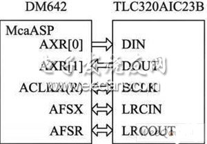 图3为音频输入框图, BCLK 为位时钟, LRC IN和LRCOUT分别为帧同步输入、输出, D IN 和DOU分别为音频输入、输出。McASP同时接入4路音频输入和输出, 系统中将McASP设置为突发帧同步模式。TLC320A IC23B 为音频编码器件, 支持麦克风、立体声输入和立体声输出, 根据G. 723 编码的要求, 话筒输入的电信号通过TLC320A IC23B进行8 K采样, 16比特量化。TLC320A IC23B 采用DSP模式与M cASP交换数据。