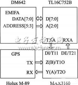 图4为GPS信号采集框图, TX 和RX分别是串行数据发、收信号。TL16C752B 采用8位异步步行存储器接口, 支持的波特率最高可达到1 Mbyte / s,与DM642的外部存储器EM IFA 连接, 地址A 2 A0用于对TL16C752B 的8 个寄存器寻址。MAX3160是多协议收发器, 可以将串口接口电平配置为RS232 /RS422 /RS485 等多种接口电平标准。GPS采集模块采用Ho lux M - 89, 它的灵敏度为159 dBm, 支援NMEA0183数据通讯协定, 其定位精度小于3 m, 高于S iRF芯片, 因此除了能很好完成高速移动定位, 更适合做步行等低速定位。