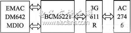 网络数据传输连接图如图5所示。DM642的网络接口是与PCI、HPI复用的, 系统中通过PCI总线的B3和B10配置为HPI16+ 以太网接口。以太网接口由EMAC(网络的数据通路)和MD IO( EMAC的状态和控制接口)两部分组成。系统中采用Broadcom 公司的BCM5221作为10 /100M 以太网的收发器(物理层)。