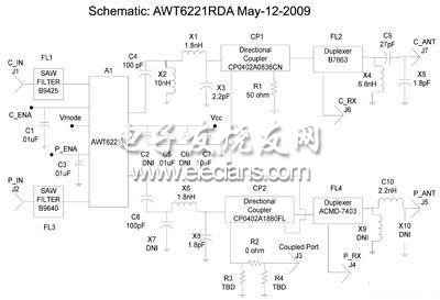 大部分CDMA和WCDMA网络的频分双工系统,允许不同的射频频段分配给上行链路(从移动到基站)和下行(从基站到移动)同时间联系。双工器用于移动设备以允许UL和DL利用单一的天线。UMTS频段2中 ,我们选择Avago科技的微型FBAR双工高Q反应的ACMD - 7403。针对Band 5,我们选择Epcos低损耗SAW双工的B - 7663。该参考设计还包括CP402A薄膜功率方向耦合器的耦合AVX,为许多顶级3G芯片组提供所需的射频功率。