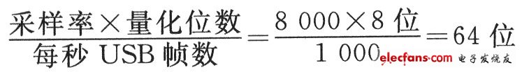 由于USB总线拓扑结构的特殊性,所有数据传输都由主机(PC)发起,在设备插上USB接口并完成初始化、列举等步骤以后,主机会按照设备列举的要求进行流量分配。USB全速模式总线以1 ms为1帧。由于采用Isoch-ronous transfers模式,为测试方便,音频格式采用8 k/s采样率,8位量化。因此单声道每帧数据量为: