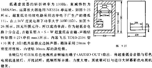 为彩色电视机加装超重低音音箱许多进口屏幕彩色电视机不仅图像清晰、色彩艳丽,而且声音系统也比较讲究,如东芝“火箭炮”伴音技术“,把低音单元单独进行放大,将低音成分提升6DB以上,使彩色电视机的音响效果大为改善。但是,目前大多数家庭中的彩色电视机扬声器口径小,声音单一。为解决这个问题,本文制作一只超重低音有源音箱,音质令人满意,现将制作方法介绍给大家。