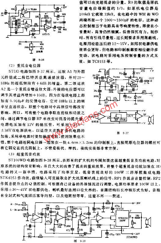 STDTD电路如图9-36所示,这是一个经过改进后的爱华XBS电路,将它接在扩大机音量电位器的两端,低音的提升随音量的大小而变。对85HZ以下的低音有15~20DB的提升,基本电路和接入方法是:将原扩大音量电位器上端的信号线断开,接入本电路的IN端,使前级信号一路经AL将中高频信号缓冲后送回原电位器上端WH,另一路经A2与外围元件组成的巴特沃兹滤波器后,低音信号再经A3放大输出到原电位器的中心抽头WO,改变R的