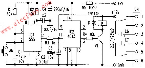 开关电路由ICl(NE555)和IC2(CD4013)两个集成电路组成,ICl及外围元件组成单稳态触发器,IC2及外围元件组成双稳态电路。控制原理介绍如下:在音响系统电源接通时,+KV端输入5V电源,C1两端电压不能突变。ICl输出高电平。