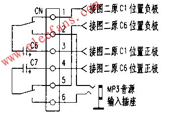 这台轿车的音响系统只有收音机和磁带放音机两种功能,能不能用现有的音响系统播放MP3音乐呢?笔者对这台汽车音响电路研究了一番,发现它的功能调节是用总线控制的。信号选择IC的型号是TDA7313,如中图所示。左声道信号通过(13)、(14)、(15)脚,右声道通过(9)、(10)、(11)脚输入集成电路进行切换。收音机信号是通过(11)、(15)脚,磁带放音机是通过(10)、(14)脚输入的。虽然还剩下两个输入端没有使用。但是该电路是用总线控制的,改动软件是不可能了。只有想办法改动硬件。经过分析。改动收音机部分比较容易。 首先把中图中Cl、C6焊下,焊到上图C6、C7位置上。信号端子CN的(1)脚和(5)脚用屏蔽线连接到中图原Cl、C2位置的负极上,(3)脚和(4)脚分别接到中图原C1、C2位置的正极上,(2)脚和(6)脚加接一个信号输入插座,作为MP3音源输入。信号输入插座和信号切换键AN分别装到音响控制面板的合适位置上。上图中的+KV电源用引线接到TDA7313的(2)脚,+12V接到音响系统的输入电源上。改动的线路如下图所示。为了保证音频信号不失真,这里用小型继电器来切换信号,经过笔者的设计和不断改进,最终形成如图所示电路。