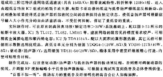 音箱结构如图9-48所示。采用密封箱体,高音单元制作与一般箱体相同,在低音单元的箱内斜置隔板,隔板上安装帕斯卡驱动器(扬声器),由独立的低频功率放大器驱动。