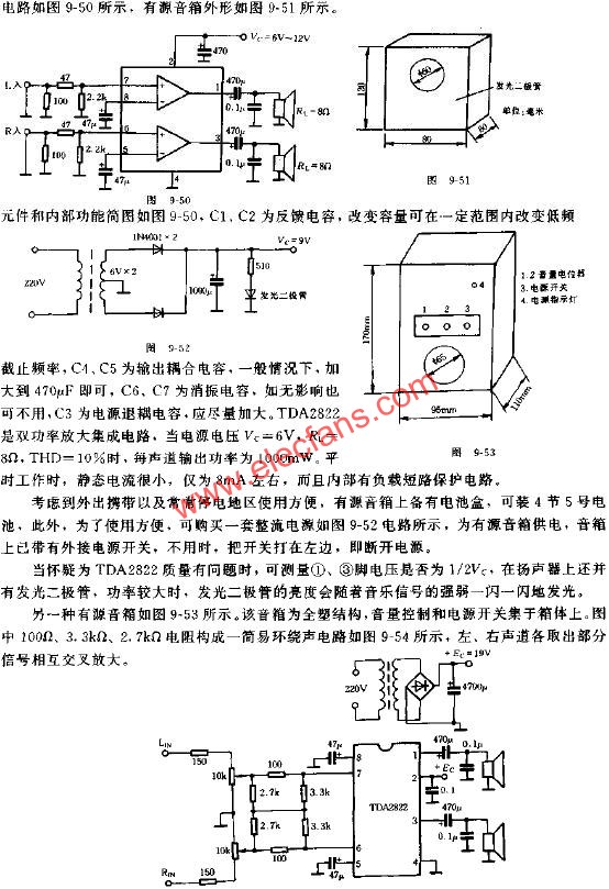 考虑到制作难度和成本不宜过大,这一套有源音箱,以集成电路TDA2822为主,辅之以宽频带高灵敏度扬声器,其体积小巧、放音优美动听。