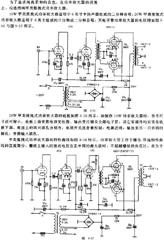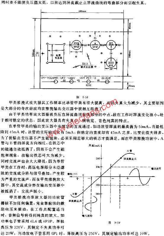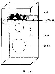 有源音箱的制作并不困难,如果有现成的音箱即可进行安装、卸下部分部件,将装好的功率放大器安置在其中,安装部位应根据箱体的结构而定,电子管有源音箱的内部结构示意如图9-55所示。