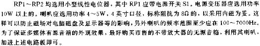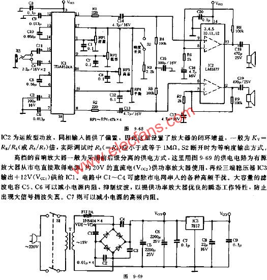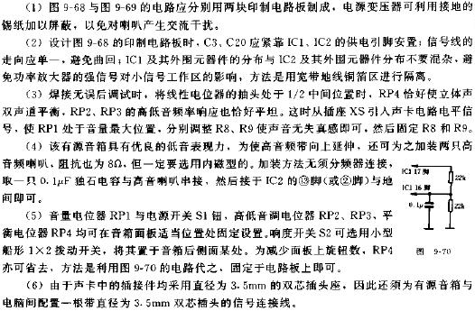 图9-68中双芯插座XS的输入信号取自多媒体声卡线路输出孔,信号经C4、C11耦合输入IC1的8、10脚,输出信号经耦合至IC2的输入端。R8、R9为两个声道的反馈电阻,