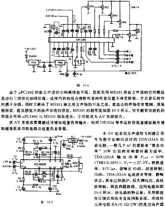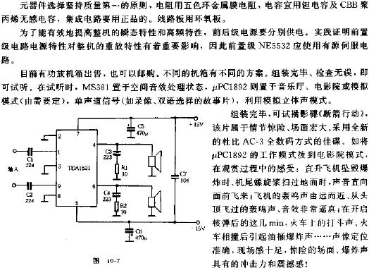 程控制。各电位器功能如下:RP1为后环绕声道音响效果音量控制,RP2为前置左右声道平衡控制,RP3为左右声道音量控制,RP4为前中置声道音量控制,RP5、RP6分别是前左右声道的低、高音控制。拨动S1、S2的作用为:S1高电平、S2低电平为音乐厅模式;S1低电平、S2高电平为电影院模式;S1、S2均高电平为模拟立体声模式;S1、S2均为低电平为立体声直通状态。
