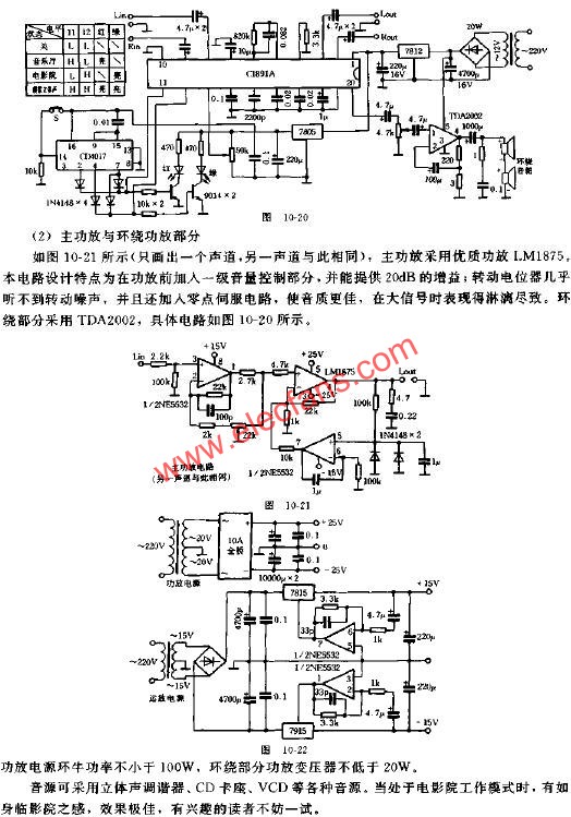 C1891A是日本索尼公司推出的家庭影院四维环绕声处理电路。该电路采用矩阵式移相环绕声放大器。还专门设立了音乐厅、电影院、模拟立体声三种音场效果模式。具体应用电路如图10-20所示,各功能引脚简介如下:2、3脚为左、右声道输出;8、9脚为左、右声道输入、10脚为环绕输出;11、12脚为状态选择脚(接+5V电平即可改变声场模式)、利用集成电路CD4017制成单键式状态选择开关,并具有色光指示,效果良好;13脚 为效果调节端。