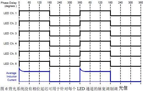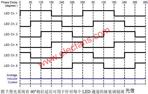 许多传统的CCFL背光系统无法向CCFL灯管添加相位延迟。基于这点,许多LED背光设计人员就延续这种做法,不向LED背光串添加任何相位延迟,但具有波动噪声降低和许多高端直下式背光架构的高级液晶除外。这些传统CCFL背光系统的设计人员常常没有可用于多通道脉宽调制相位延迟的控制信号。此外,有限的时间和资源限制了为电视系统增加新的控制界面和微控制器。最新一代的LED背光IC控制器可针对LED背光电流阱脉宽调制调光信号内部生成用户可编程的相位延迟,从而解决了这个难题。图7显示,针对CCFL背光设计的液晶电视具有在120Hz到480Hz范围内的简单脉宽调制调光信号,并使用了可编程相位延迟。在这种情况下,一个侧入式背光应用可使用6个LED电流阱通道,从而实现了从现有的CCFL液晶电视到LED背光的升级。这6个通道就具有60度相位延迟,可用于平均分配通道开启/关闭时间,并通过LED串交流-直流或直流-直流升压电源降低峰值电流和平均电流。这就提高了电源效率,并且通过降低峰值电感电流,可为系统选择具有更低饱和电流规格的低成本电感器。