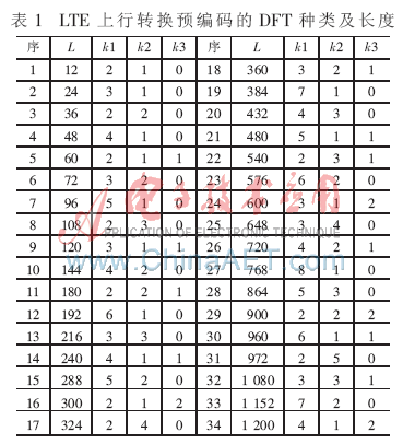 图1中的转换预编码是由一种对称形式DFT完成,其种类及变换长度L=2k1×3k2×5k3(L≤1 200)见表1。