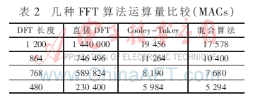 表2中的混合算法指Good-Thomas算法与Cooley-Tukey算法相结合。可以看出,Good-Thomas算法与Cooley-Tukey算法相结合与文献[4]相比,减少了级间旋转因子乘法数,可以有效降低运算量,这些运算量的降低对整个系统的实现起着至关重要的作用,而其付出的代价只是复杂度的略微提升。