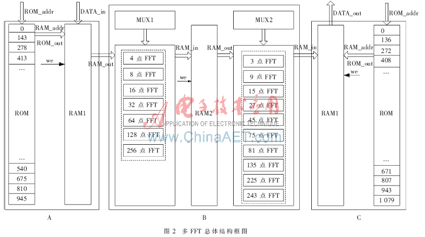 图2所示总体结构框图中,模块A和C分别为数据输入和输出模块;模块B为数据处理模块,其主要思想是动态配置和公共模块的复用,内部FFT模块事先单独生成,MUX1,MUX2是选择器,在不同输入点数的情况下动态配置不同的内部FFT模块来组合成外层FFT,这样内部FFT模块就可以达到复用的目的,可以大大减少总体资源耗用,而处理速度也与单独执行各FFT相当。