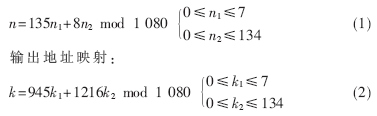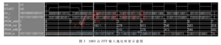 FPGA内嵌Block RAM的使用可以大大节省FPGA的可配置逻辑功能块(CLB)资源。Good-Thomas算法需要对输入输出数据进行排序,输入输出端处理方法相同,这里只介绍输入端处理。在输入端,鉴于Block RAM的特征,设置一个ROM和RAM,如图2模块A所示。对于不同长度的FFT,ROM不同,但RAM可以共用。在ROM里预先存放输入数据在RAM1中的位置序号,此位置序号由(1)式得到,在时钟沿到来时,先顺序读出存储在ROM中的位置序号,将此数作为RAM1的地址输入,就能将输入数据存放到RAM1中的不同位置。这样在输入数据的同时完成了数据的排序,一举两得。1 080点FFT的输入和输出端地址索引如图2所示,其逻辑时序图见图3。图3中,RAM_in由测试数据xn_i和xn_r进行位拼接后输入。