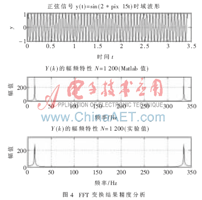 由图4可以看出FFT处理器处理后的结果和Matlab计算的理论结果基本一致,都在频率为15 Hz和335 Hz处取得最大FFT绝对值,两者之间的误差正是数字信号处理量化效应的体现。从整体看,这些误差是数据在经过采样量化和截断处理后不可避免的且是可以容忍的,因此可以判断测试结果符合精度指标。