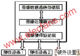 通常,图像软件系统是分层构造的,图1给出了图像软件系统的分层结构。图中虚线框部分是图像软件系统,其中底层是硬件驱动层,主要解决和硬件的联接问题,中间层是处理层,实现各种各样的算法,最上面一层是数据的存储和通信。