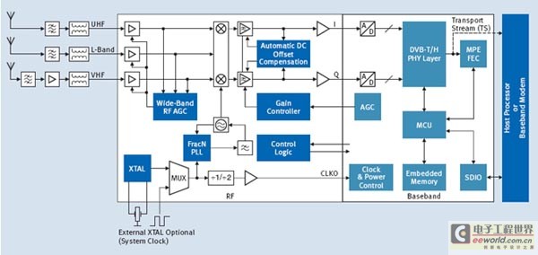 图1显示了从天线输入端至连接主机或多媒体处理器组件的SDIO接口输出端的系统架构框图。