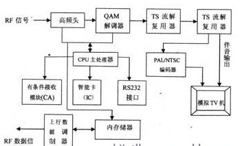 数字电视机顶盒由高频头、QAM解调器、TS流解复用器、MPEG一2解码器、PAUNTSC视频编码器、嵌人式CPU系统和外围接口、CA模块和上行数据调制器组成。工作原理如附图。