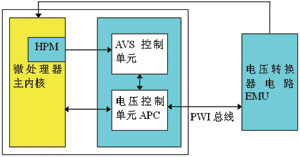 在AVS工作模式中,当CMU为一个新的工作状态请求一个新的频率,并为该状态设定一个新的HPM时钟时,AVS的频率就开始变化。随后APC环路控制器使用硬件性能监视器HPM数据来确定所需的调节频率。它反复调节电源电压,直到能满足新频率的要求(如图3所示)。这一过程听起来虽然比较复杂,但是具有补偿工艺和温度波动、时钟频率变化、电源变换器偏移等优点。与电压固定的系统相比,AVS模式实现的动态电压控制最多能降低70%的功耗。