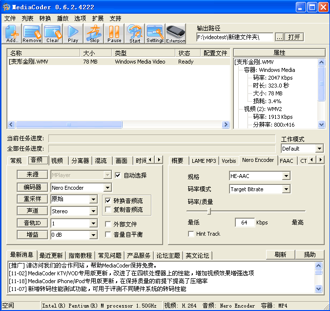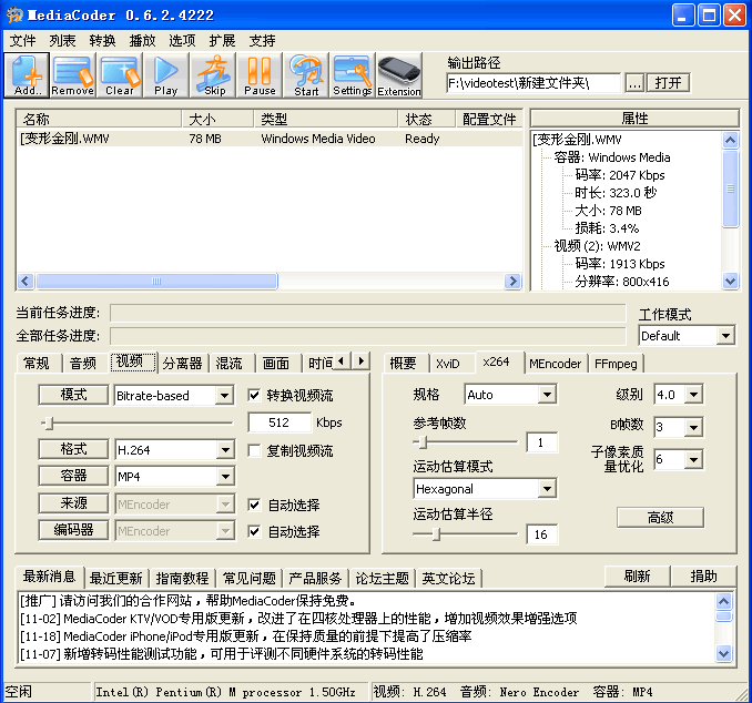 MediaCoder中文名称为影音转码快车,是一个免费的通用音频/视频批量转码工具,由国人黄轶纯开发的自由软件,它将众多来自开源社区的优秀音频视频编解码器和工具整合为一个通用的解决方案,它可以将音频、视频文件在各种格式之间进行转换。现在主要是用它的转换H264功能。