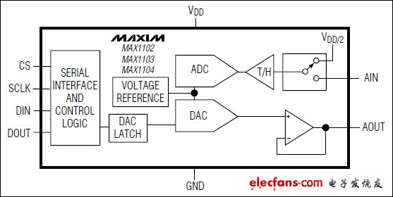 该MAX1102/MAX1103/MAX1104是与微控制器(μCs)使用低成本,低功耗编解码器。他们允许更大的灵活性,在选择微控制器。没有内建转换器可以较便宜μCs,同时保持整体系统性能。
